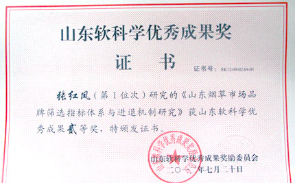 我院一科研项目荣获山东软科学优秀成果二等奖 发布时间:2012-09-25 00:00 浏览 次 近日,2012年山东软科学优秀成果奖评审结果揭晓, 我院张红凤教授主持完成的“山东烟草市场品牌筛选指标体系与进退机制研究”项目获山东软科学优秀成果奖二等奖。本年度我校共有35项软科学成果荣获“山东软科学优秀成果奖”。