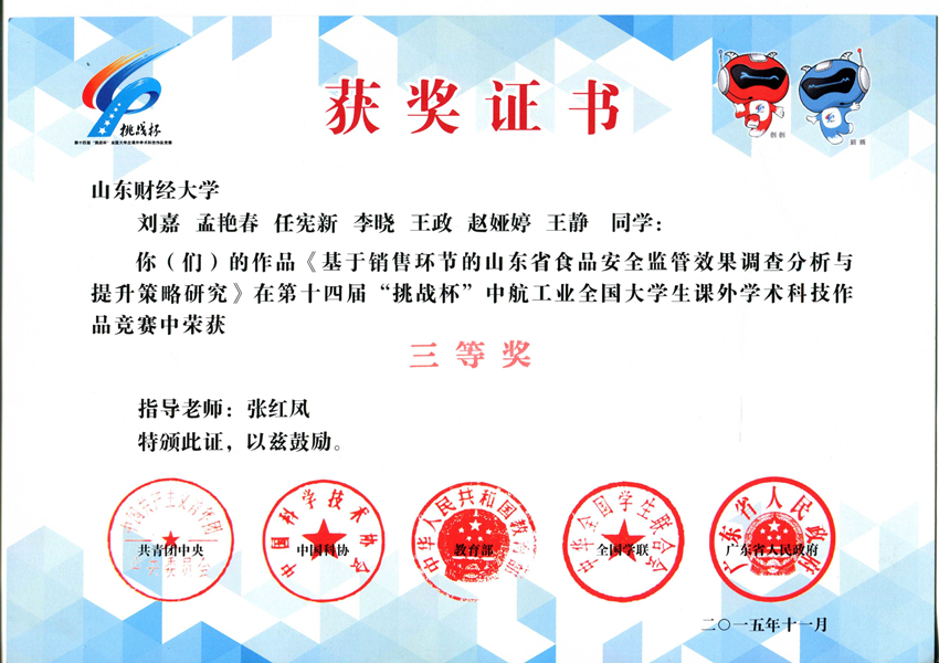 近日,由共青团中央、中国科协、教育部、全国学联和广东省人民政府共同主办,广东工业大学、香港科技大学联合承办的第十四届“挑战杯”中航工业全国大学生课外学术科技作品竞赛决赛在广州举行。我院作品《基于销售环节的山东省食品安全监管效果调查分析与提升策略研究》参加全国终审决赛并获三等奖。副校长胡文波和有关部门、学院负责人看望了参赛学生,并参加了决赛项目展示暨创新创业成果交易会等活动。