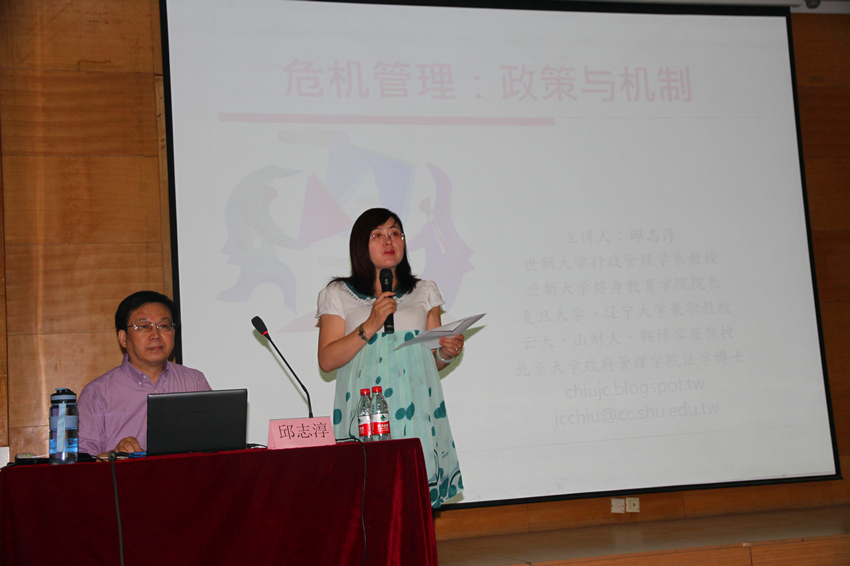 讲座伊始,邱教授指出现代社会充满形形色色的风险与危机,任何意外、偶发事件皆可能造成很大的影响,要有风险与危机意识,对危机的管理在现代社会至关重要。随后邱教授围绕危机管理的基本概念、应变计划、预测与处理、管理决策、复原以及评估与追踪等多个方面的内容,深入浅出、生动有趣的从内涵、特征与类型、模式、措施、机制等多种角度讲述了如何对危机进行有效的管理。邱教授的讲座论点独特,博古通今,引经据典,诙谐幽默,淋漓尽致地展现了他深厚的学术底蕴和睿智的学术观点。