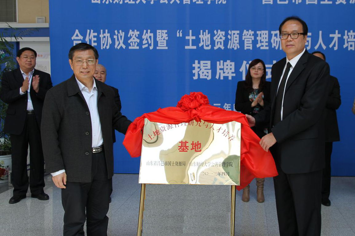 4月26日,我院与昌邑市国土资源局全面合作协议签约暨“土地资源管理研究与人才培养基地”揭牌仪式在昌邑举行。学校党委委员、副校长吴彬教授出席签约仪式,并与潍坊市国土资源局党委委员孙希志共同为“土地资源管理研究与人才培养基地”揭牌。suncitygroup太阳成集团院长张红凤教授和昌邑市国土资源局王铁楼局长分别代表suncitygroup太阳成集团与昌邑市国土资源局致辞并签署合作协议。我院副院长李国锋、办公室主任张禹、土地资源管理教研室主任秦艳红老师和焦霄黎老师,昌邑局的班子成员、局机关及直属事业单位全体人员等一同出席签约和基地揭牌仪式。签约和基地揭牌仪式由昌邑市国土资源局党委书记崔法贵主持。