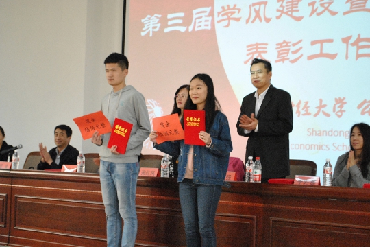 (通讯员:李昭娜 孙文静 贺慧敏 摄影:刘菁 郑璐) 3月29日下午,我院在明水校区5201召开了第三届学风建设暨学团工作表彰大会。院长张红凤、党委书记李国强、学生处副处长孙丽华、党委副书记周炎、团委书记王恩娟、辅导员李昭娜、张辉出席了会议。2016级学生代表以及2017级全体新生参加了此次会议。