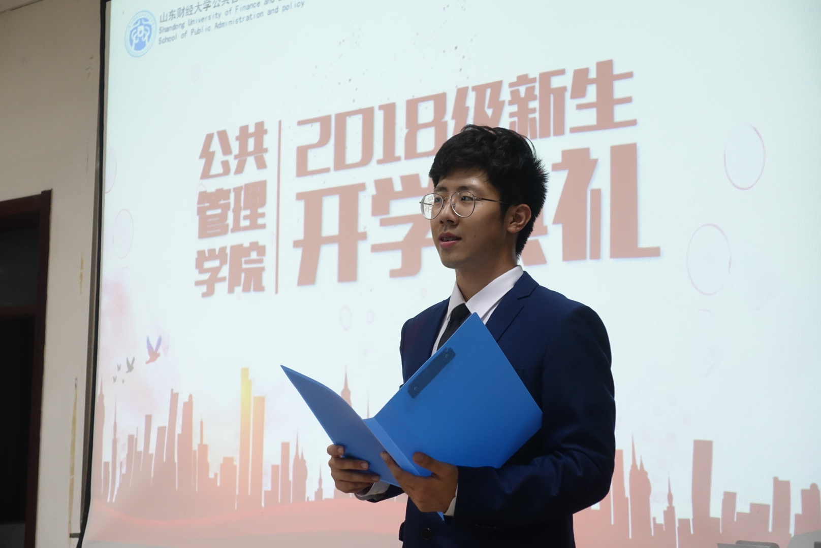 接下来,2017级学生代表祁培宸和新生代表胡明琰分别发言。祁培宸结合自己大学一年的学习、生活、工作经历发表了感想,以三个问题:我们是谁?我们在做什么?我们去哪儿?希望同学们能时时自省,努力奋斗,把握青春年华,做新时代出彩的公管学子。