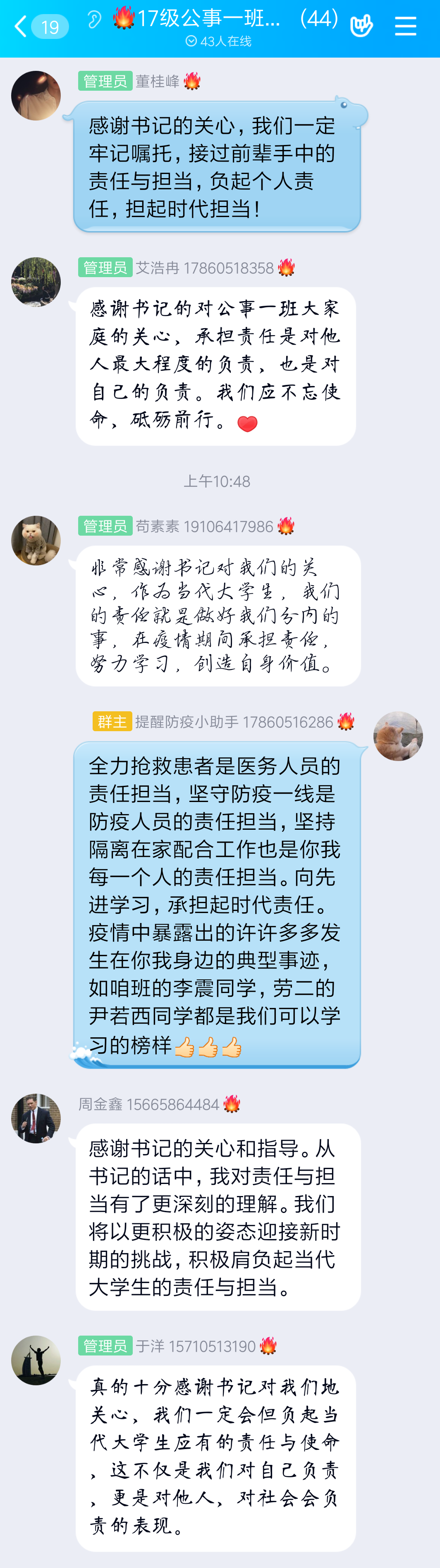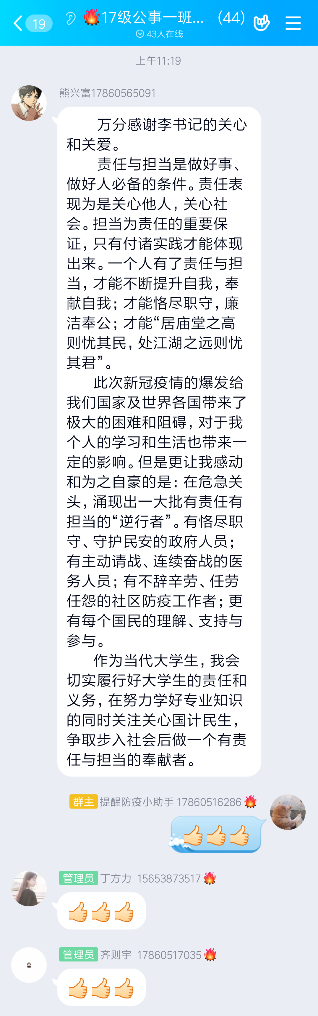 (通讯员 王梦圆)4月6日,我院2017级公共事业管理一班全体同学致信学院党委书记李国强,对疫情期间李书记对同学们的关怀致以由衷的敬意和感谢,并结合疫情防控就大学生应如何肩负起新时代的责任与担当表达了自己的见解,希望得到李书记的指点。