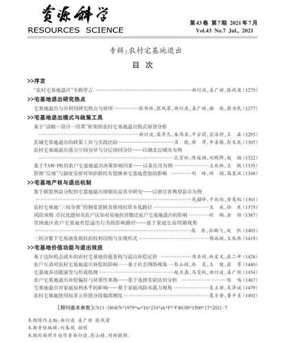 近日,我院曲衍波教授作为客座主编,在《资源科学》上组织的“农村宅基地退出”专刊出版。该期刊为我校的A2类期刊。该专刊聚焦“宅基地退出研究热点”“宅基地退出模式与政策工具”“宅基地产权与退出机制”“宅基地价值功能与退出效应”4个领域,邀请了国内50多位同行学者,撰写了17篇论文。