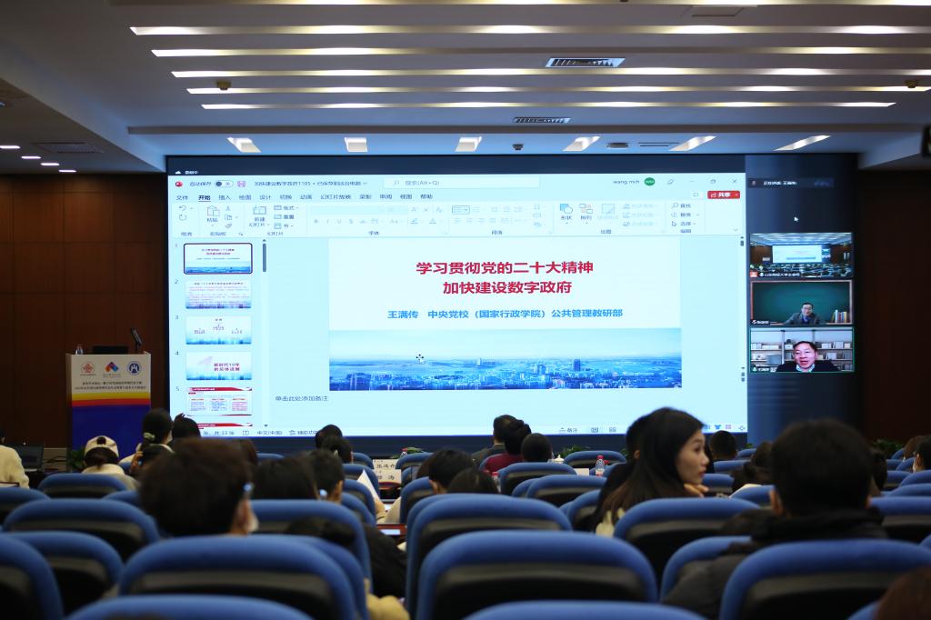 大会主旨演讲环节,中国行政管理学会副秘书长、《中国行政管理》杂志社社长张定安研究员,中国行政体制改革研究会常务副会长、秘书长,中共中央党校(国家行政学院)公共管理教研部主任王满传教授分别以“深化行政审批制度改革推进政府治理现代化”“学习贯彻党的二十大精神加快建设数字政府”为主题发表了主旨演讲。太阳成城集团公共管理与法学学部部长、山东省行政管理学会副会长张红凤教授主持开幕式及主旨演讲。