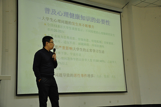 11月19日,我校在明水校区5201教室开展了学生心理健康讲座活动,本次讲座邀请了山东大学医学精神卫生研究所、山东省精神卫生中心的王旸博士担任主讲人。我校学生处有关领导出席了此次会议,我院14、15级全体班长和心理辅导员参加了本次讲座。