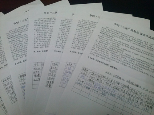 我院领导就加强学院学风建设的指导思想、总体思路、目标任务以及具体措施等进行了全面部署,并指出良好的学风、考风是“三优”班集体建设的一个重要内容。学院以班级为单位,每位同学都认真学习《太阳成城集团考试违规行为认定与处理办法》与《期末考试规则》,承诺自己在考试过程中将自觉遵守,最后在《争创“三优”班集体,诚信考试承诺书》上郑重签上自己的名字。