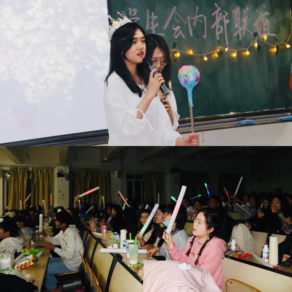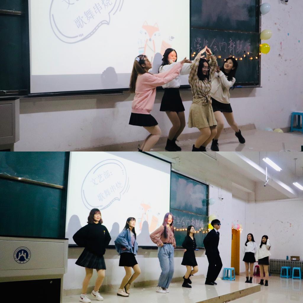 晚会中间穿插了中场小游戏,台上台下互动连连,在两位副部长的配合下,高能的击鼓传花让同学们兴奋不已。紧接着新媒体中心魔性的舞蹈《群魔乱舞》、纪检部的小品串烧《打不“通”的电话》接连上演;外联部小品及舞蹈《四大才子》和文艺部的歌舞串烧更是让全场沸腾;女生部的小品《今天我们就奔现》、宣传部的表演《好运小白马的诱惑》、民族事务部的情景剧《龙王赘婿》、大学生事务发展部的表演《好运青年真不戳》、生活卫生部联合大学生事务发展部的舞蹈《爱河》相继上演,将现场气氛推向高潮。两位学长在游戏环节的歌唱表演引起全场共鸣,大家自发地挥舞手中的荧光棒,主动应援,各部门干事在阵阵欢声笑语中打成一片。在晚会的最后,播放了各部门副部长为新干事精心录制的暖心视频,表达了对新干事诚挚的祝福和殷切的期望。