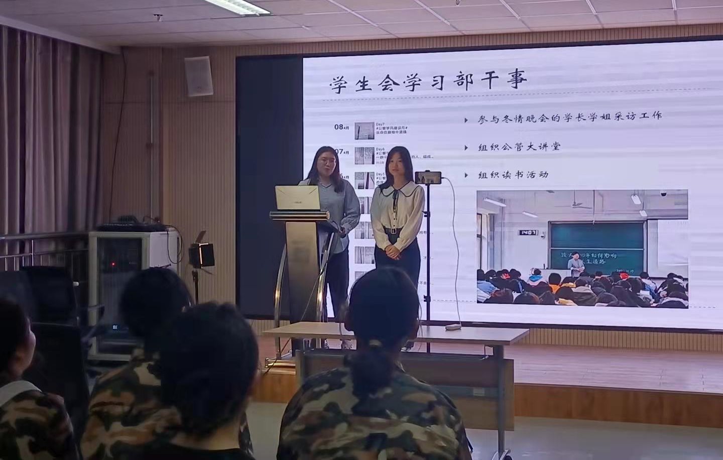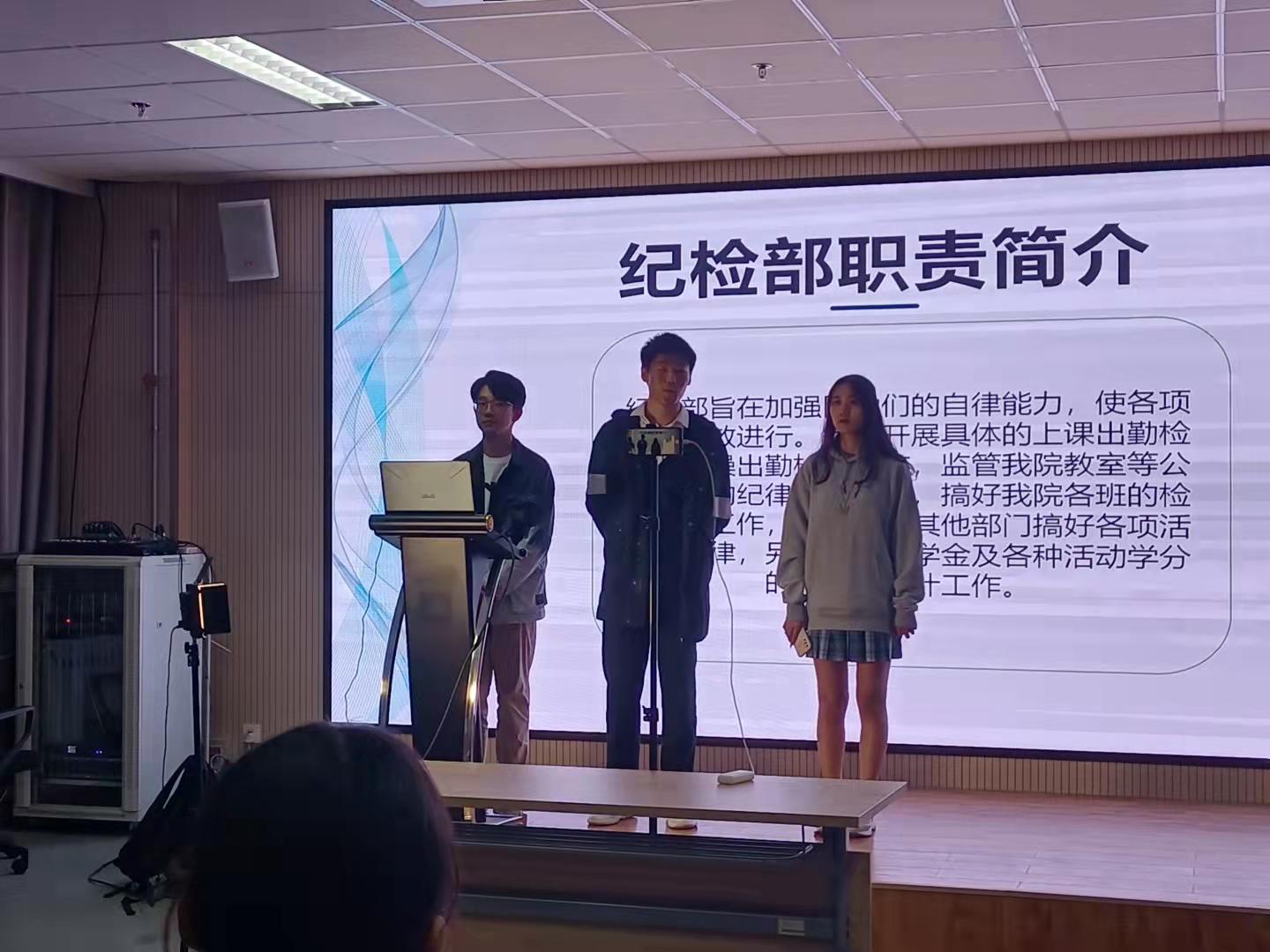 宣讲会伊始,各部门负责人学生会的基本职责为切入点,结合自身在学生会多年的经历,讲述了对学生会的认识以及加入学生会的感悟和收获。各部门副部长从部门职责,团建活动等方面展开宣讲,通过播放幻灯片、快闪视频等方式展现各部门的优势、特色。