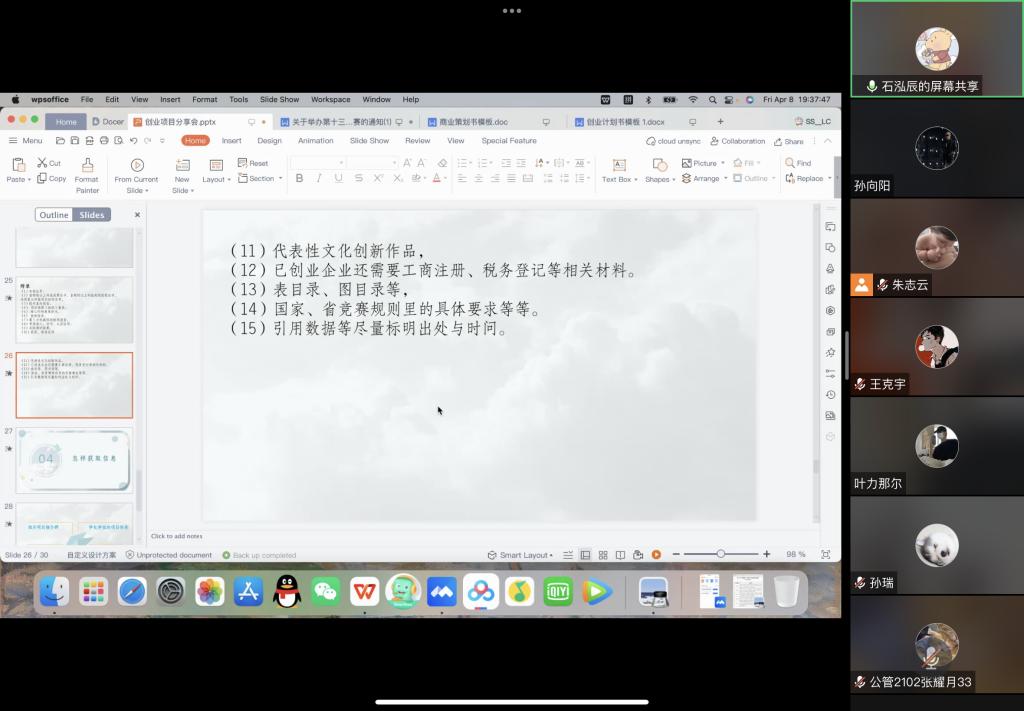 (通讯员 孙向阳)为深化高等教育综合改革成效,激发大学生创新创业能力,4月8日晚7点,我院通过腾讯会议向全院本科学生召开国创分享交流会,会议由科创部部长朱志云主持,劳动与社会保障1901班石泓辰、王克宇主讲。