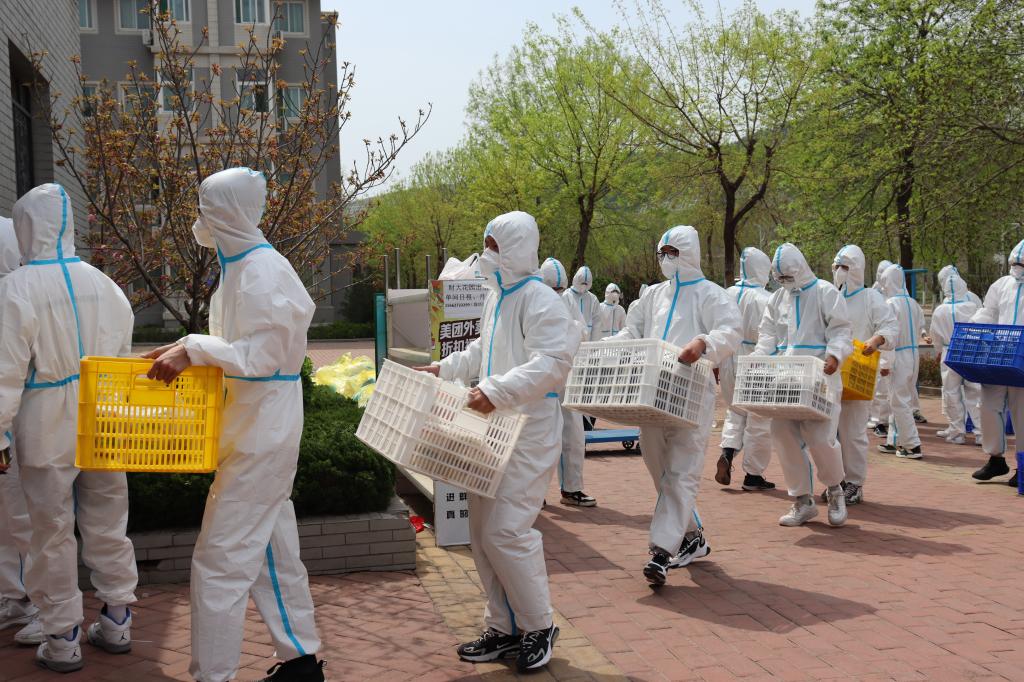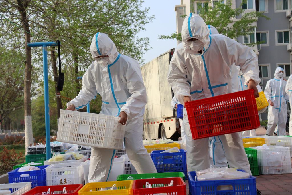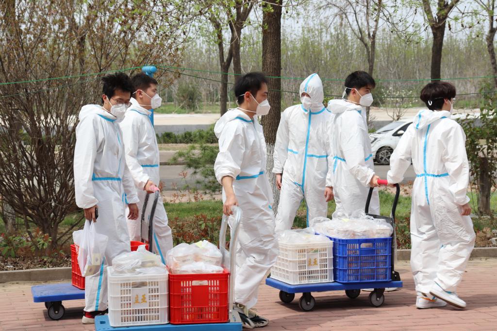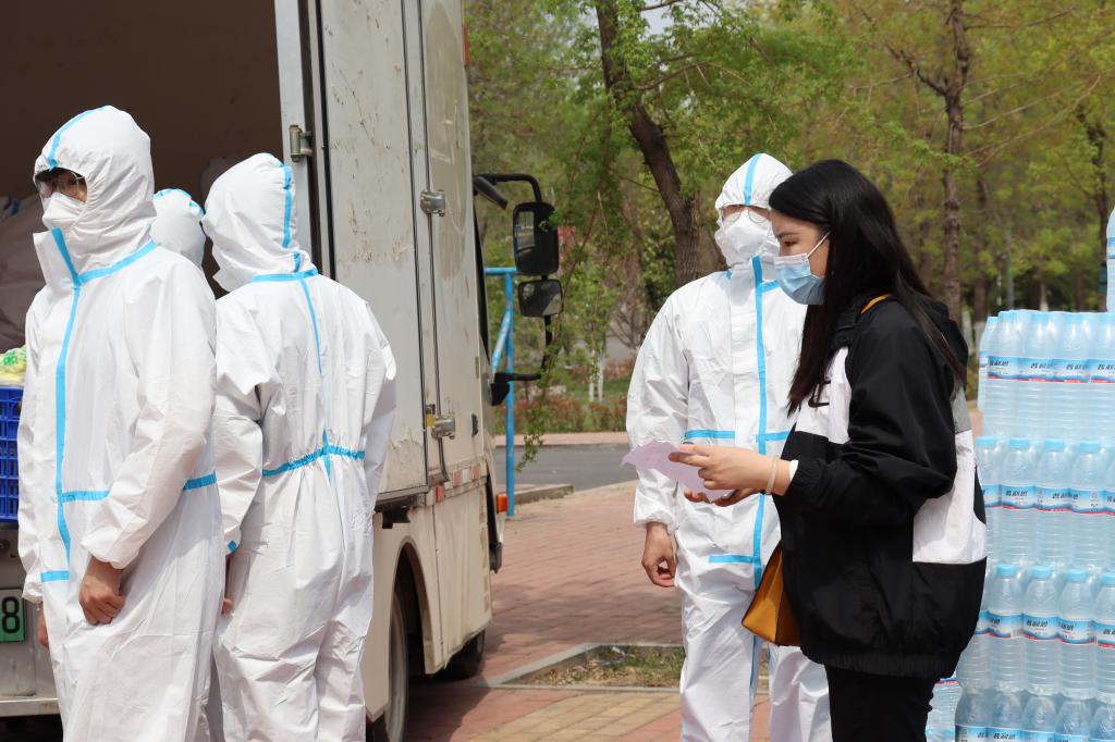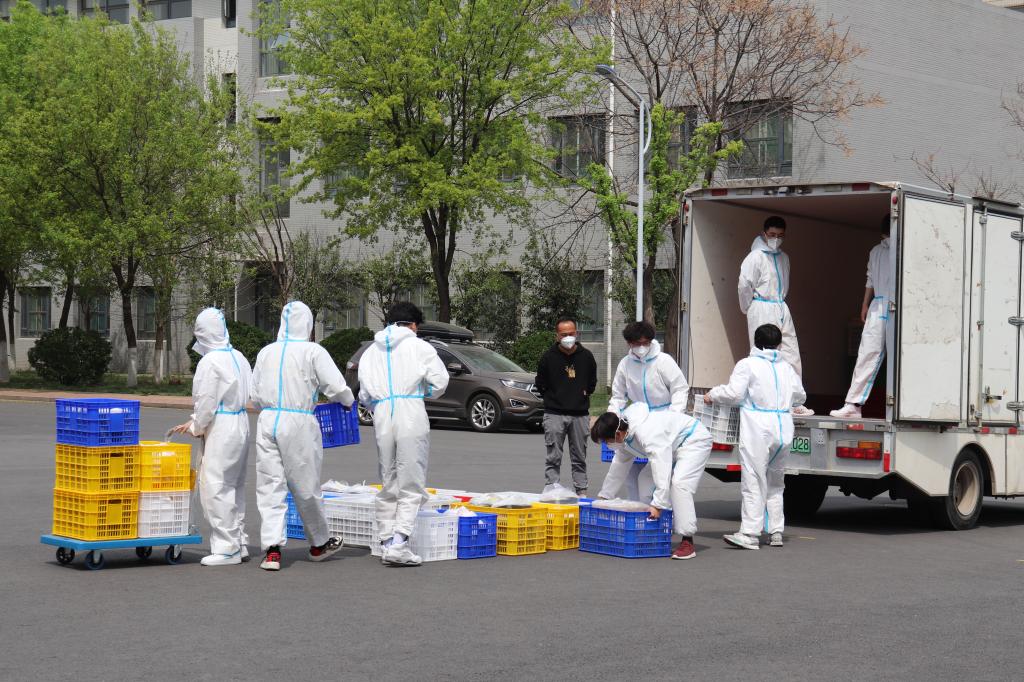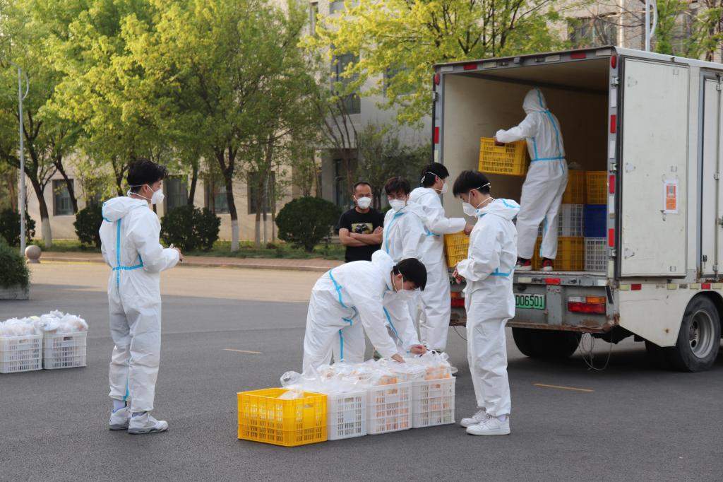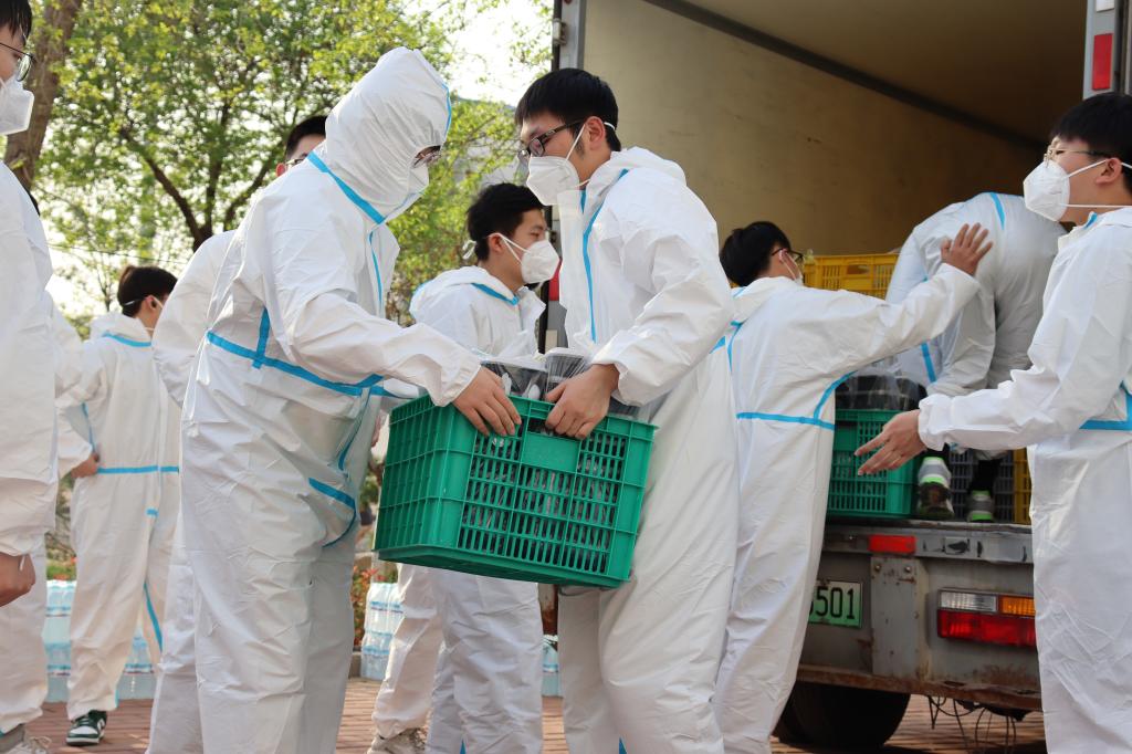 在接到送餐任务要求后,我院积极响应,由辅导员张辉、韩步彤进行组织安排。4月8日晚,suncitygroup太阳成集团40名志愿者收到疫情防护服和口罩,其中防护服一餐一套,严格保障食品安全,口罩分配专用防疫口罩,确保志愿者安全。接着学院对40名志愿者进行分组,第1组20名同学去二号餐厅装车;第2组20名同学在宿舍楼门口卸车并且按学院分餐。