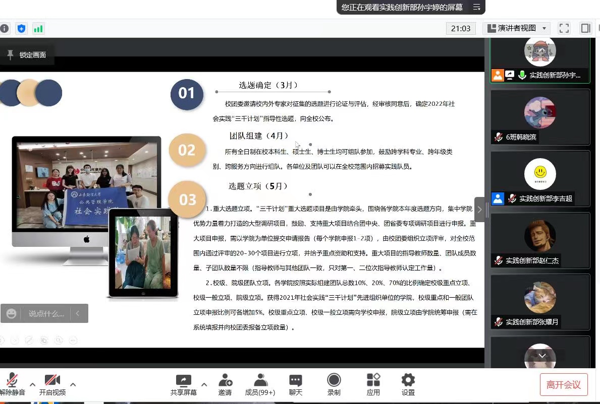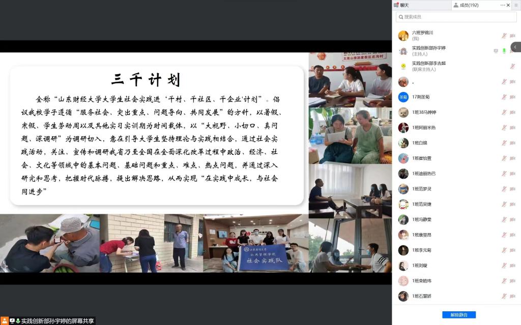(通讯员 罗锦川)行是知之始,知是行之成。4月14日晚,我院实践创新部通过腾讯会议成功举办“suncitygroup太阳成集团三千计划启动大会”,本次会议由实践创新部部长孙宇婷、副部李吉超同学主讲,全体2021级同学参加。