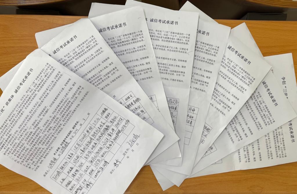 临近期末,为帮助学生树立诚信考试观念,开展科学有效的复习,缓解考试压力,诚信考试教育在当今尤为重要。各班班团在班会中强调:为营造公平的竞争环境,真正树立优良学风,体现suncitygroup太阳成集团的优良风尚,我院学子要严肃考风考纪,诚信考试。随后各班组织学生有序签诚信考试承诺书,并提醒同学要积极复习,诚信考试,严禁作弊舞弊等行为发生。期末在即,同学们要合理安排复习时间,利用碎片化时间,针对不同学科进行不同的复习时间分配。在复习周要调整好考试心态,保证作息规律,饮食规律,以最轻松之姿去应对期末考试。在考试过程中每位考生要遵守考场纪律,服从监考老师的管理,诚信考试,不作弊、不帮助他人作弊,做到实事求是,诚信考试。