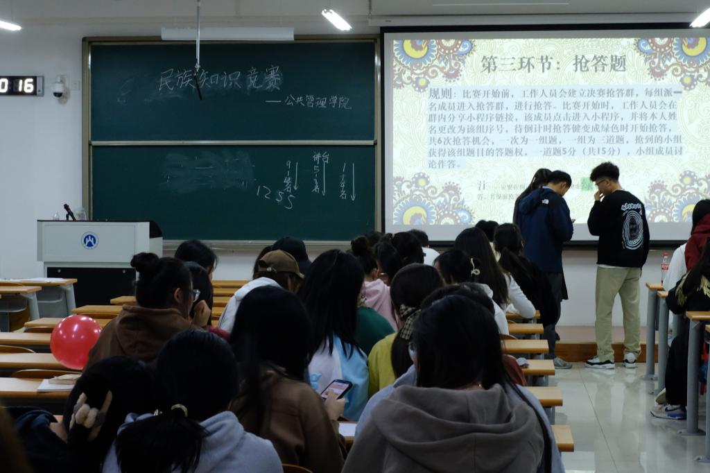 抢答题更是将整场比赛推向了高潮,台上的选手拼反应、拼积累,台下的选手屏气凝神,为各自队伍的选手默默加油。各个队伍凭借默契的配合和丰富的民族知识,经过激烈角逐,最终21级行政管理3班、21级劳动与社会保障2班突出重围,获得了本次竞赛的一等奖。民族知识竞赛活动到此落下帷幕。