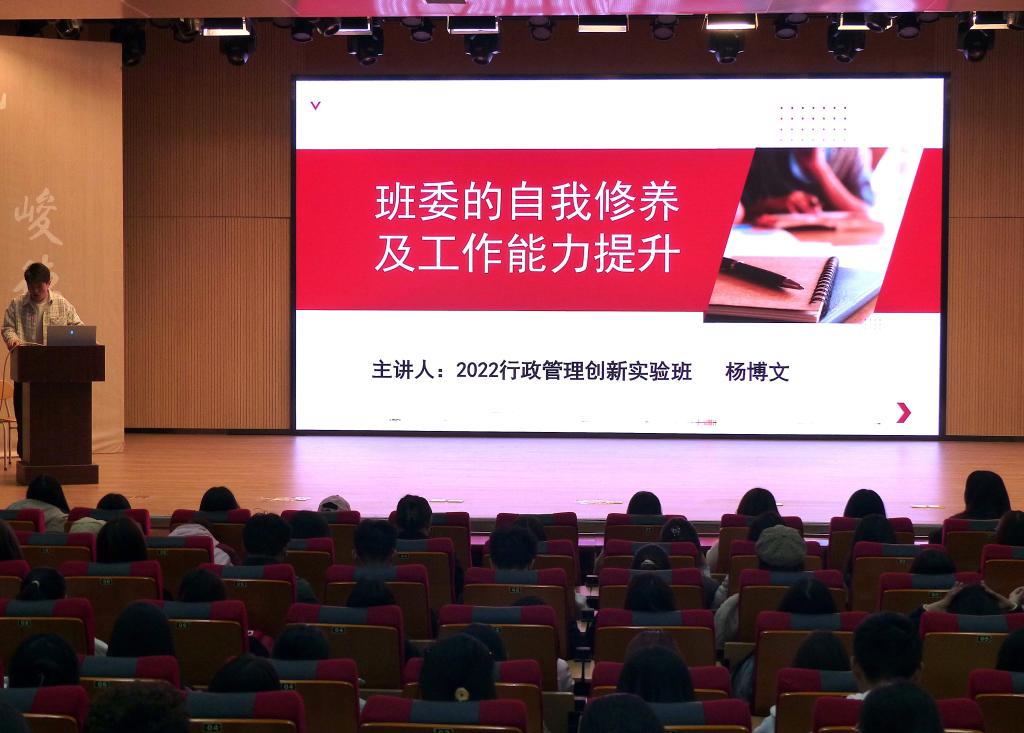 2022级行政管理创新实验班班长杨博文为大家带来了“班委的自我修养及工作能力提升”的分享。他提醒同学们,首先要明确学生的身份,始终把学习放在第一位,并且遵守校规校纪,以身作则以树立良好榜样的形象。作为班委,也要有平和的心态和稳定的情绪,勇于承认不足,在实践中促进成长。