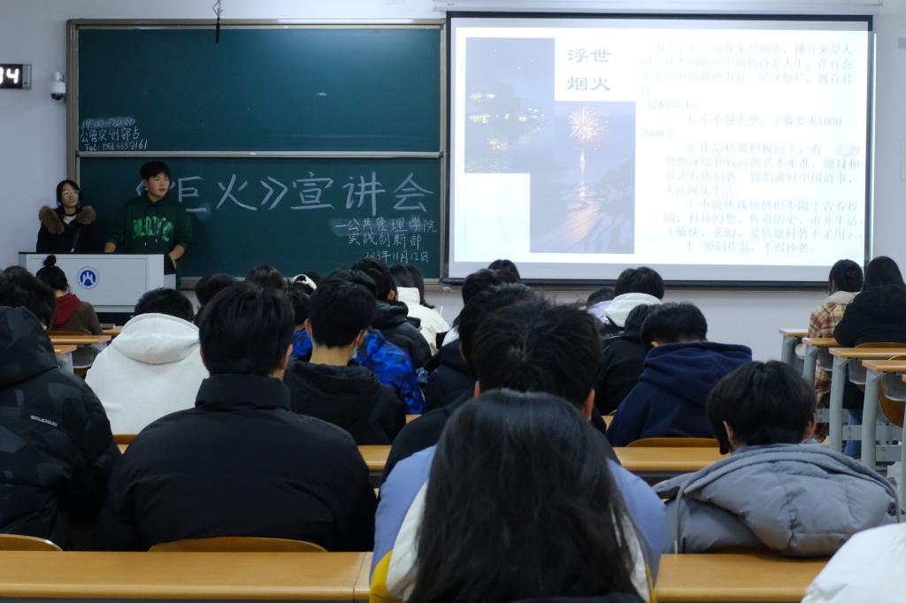 宣讲会上首先提到了“炬火”的内涵,用定位和性质阐明了其在学院的重要意义。随后对院刊各个板块的设立意义、征稿内容、征稿要求逐个指点说明。学生不仅能在“拨云见光”板块中感受文化魅力和抒发个人情感,还能在“经世明理”板块中散发辩证统一的理性光辉。