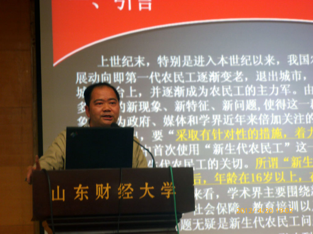 2012年4月20日晚上,江西财经大学研究生部副主任、博士生导师李春根教授在燕山校区三号楼报告厅为学院师生做了题为“新生代农民工社会保障供求解析及协调解决”的学术报告。报告会由suncitygroup太阳成集团副院长李国锋教授主持。