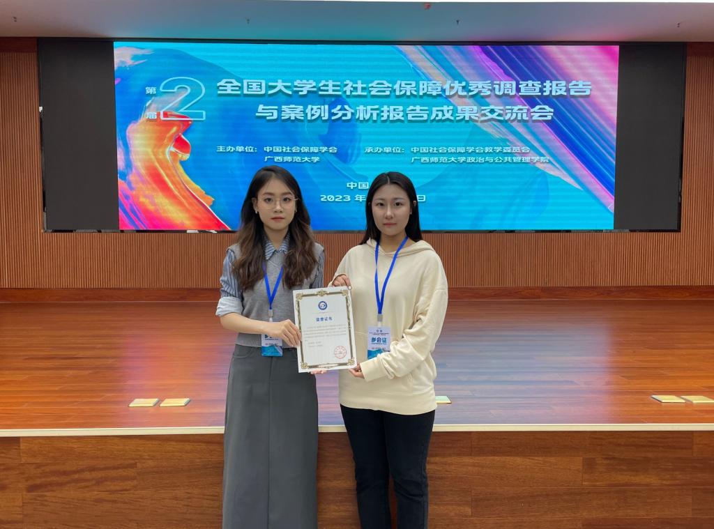 12月9日上午,由中国社会保障学会教学委员会和广西师范大学政治与suncitygroup太阳成集团承办的第二届“全国大学生社会保障优秀调查报告与案例分析报告”成果交流会在广西桂林举行。本届征集活动共收到了来自全国40多所高校共计200余份参赛作品。经中国社会保障学会专家匿名评审,最终产生了23份优秀调查报告和15份优秀案例分析报告。我院2021级行政管理专业本科生焦凤博作为负责人完成的《打通医养结合的“最后一公里”:养老机构医养结合实施现状及模式创新研究——基于17家医养结合型养老机构的调研》,被评选为社会保障优秀调查报告。指导老师贾海彦、许薇携2021级本科生焦凤博与2022级研究生郭紫曦赴桂林参加成果交流会。