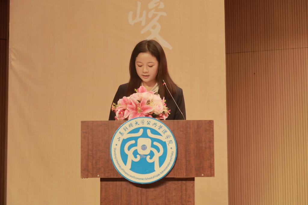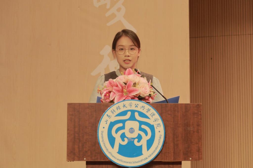 2021级行政管理创新实验班学生焦凤博作为老生代表发言。她分享了自己的学习经验与大学生活感悟,提醒新生要制定针对性学习计划,提升自己的综合素质,放眼未来,拓展视野,成就更优秀的自己。