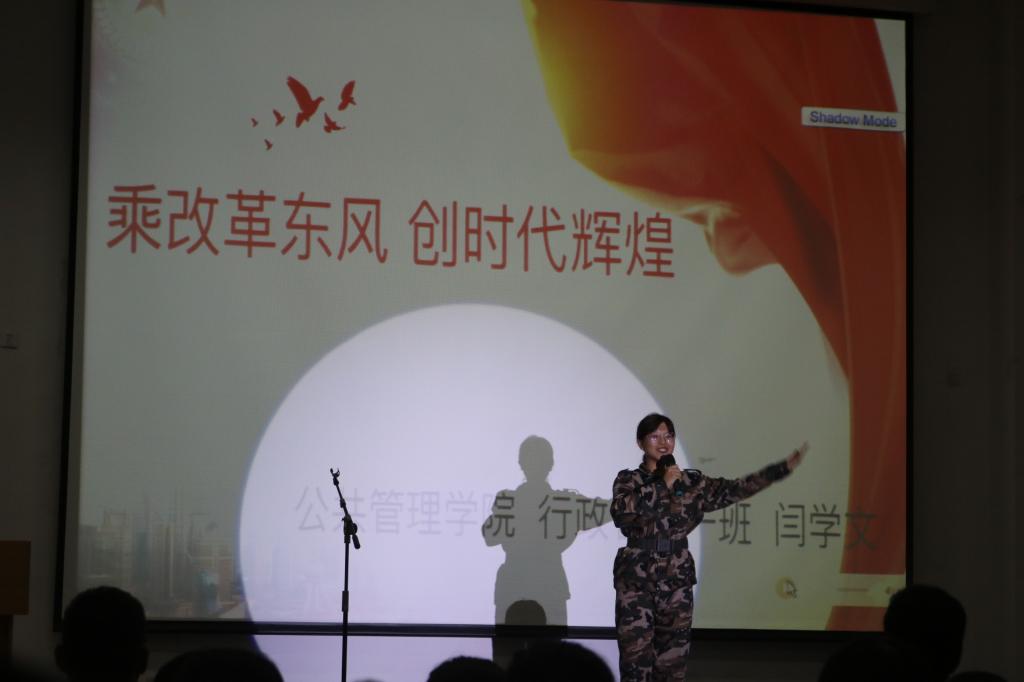 经过激烈的角逐后,我院18级行政管理1班的闫学文同学凭借扎实的功底、稳重的台风、高昂的激情、精彩的演讲获得了决赛二等奖。她的演讲以《乘改革东风,创时代辉煌》为题,叙述了中国改革开放四十年来的政治、科技、环保、精神思想等伟大成就,通过守林老人孙志强、最美消防员杨科璋等典型人物传播了爱国爱党的思想,发出了新一代青年人要惜时进取,自强不息的号召,展现了当代大学生向党爱国的精神风貌和对自我价值的认知思考。
