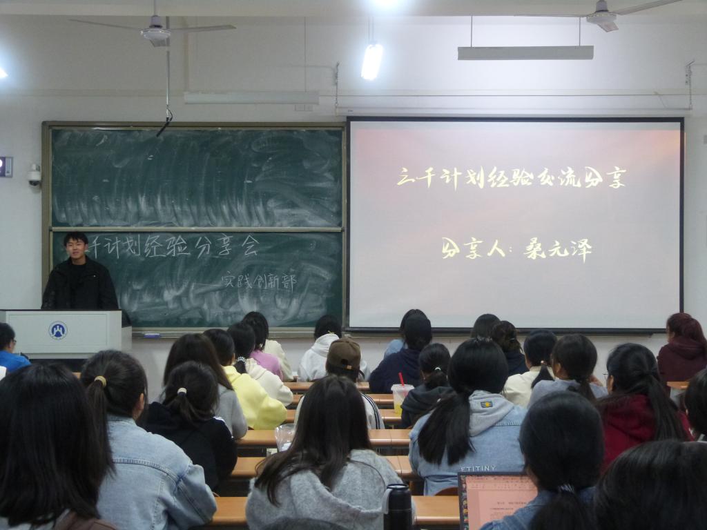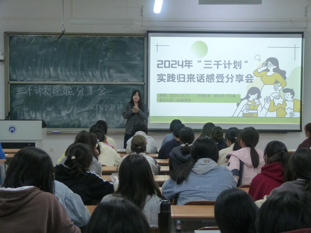 (通讯员 张心仪 摄影 李小茹)为深化学生对“三千计划”社会实践活动的了解,进一步发挥专业优势,涌现更多优秀的调研团队。10月17日晚,学院于圣井校区8-102教室举办了“三千计划”经验交流分享会。此次活动由学院实践创新部组织,2024级同学参加。